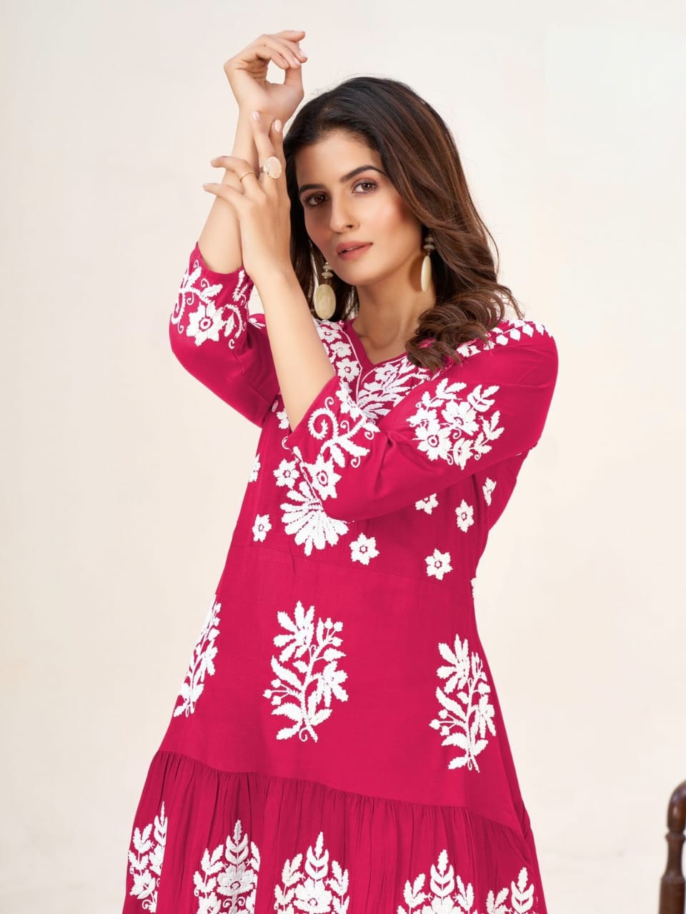 Frill and Flare Midi Dress with Lakhnavi Work-Pink